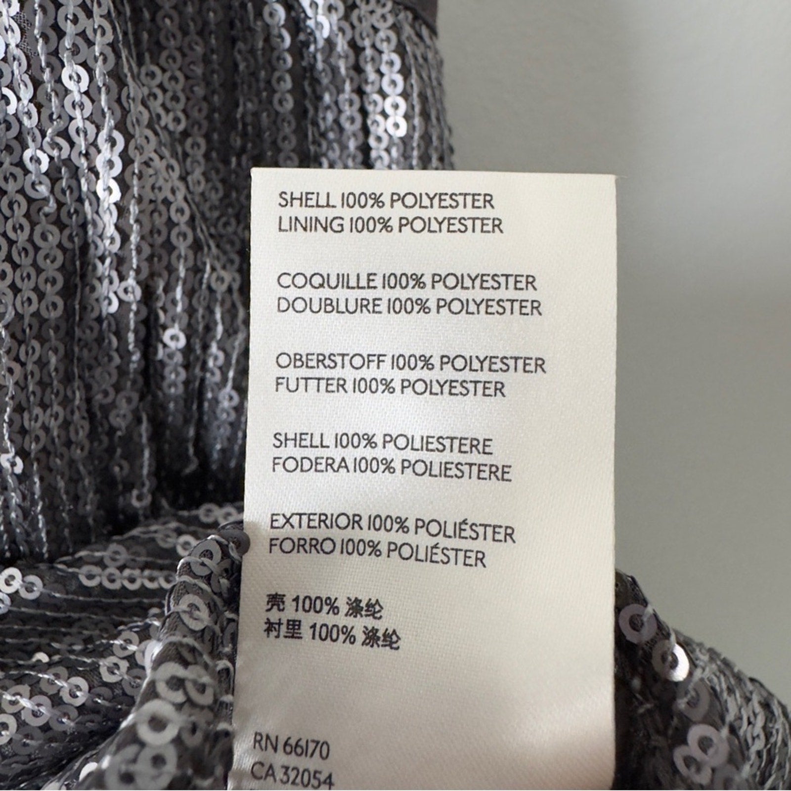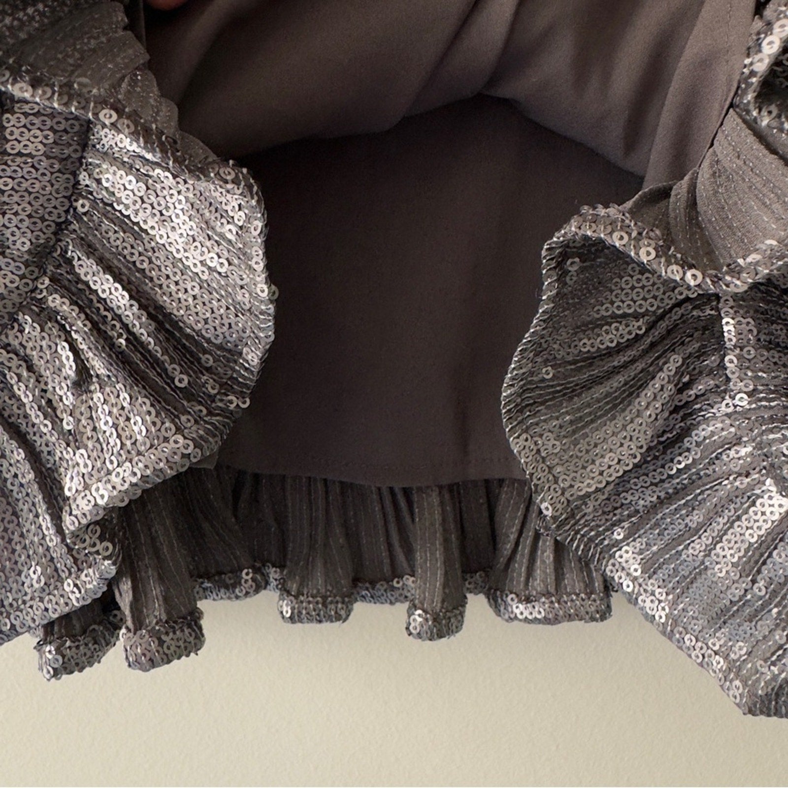 This beautiful camisole features a dazzling silver sequin design with a ruffled hem, perfect for adding a touch of glamour to any outfit. The sleeveless style and elegant finish make it ideal for evening wear or special occasions.