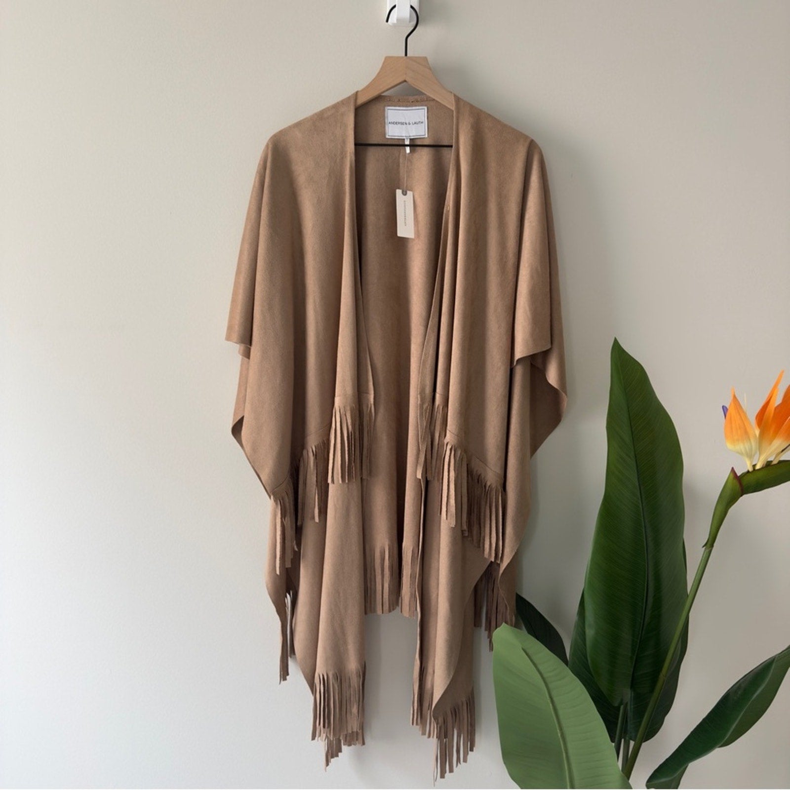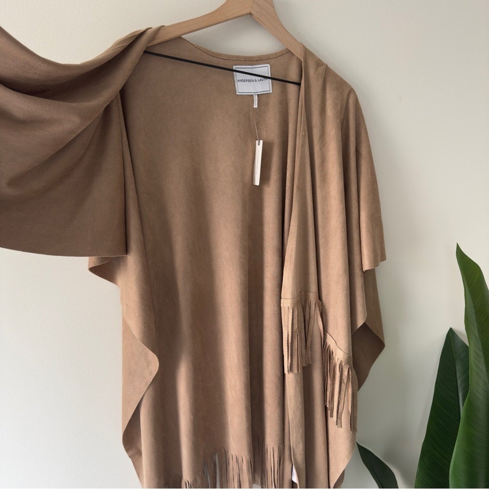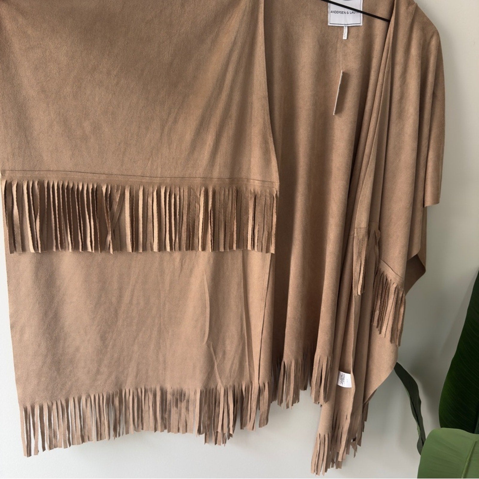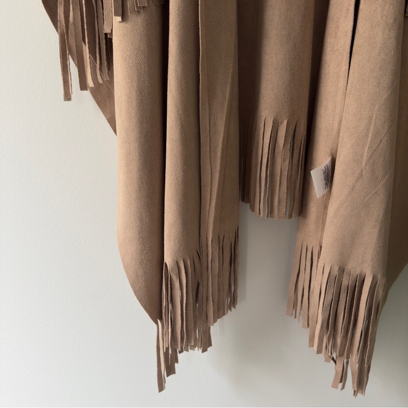 Anthropologie Andersen & Lauth Faux Suede Poncho Tan Open Front with Fringe hem