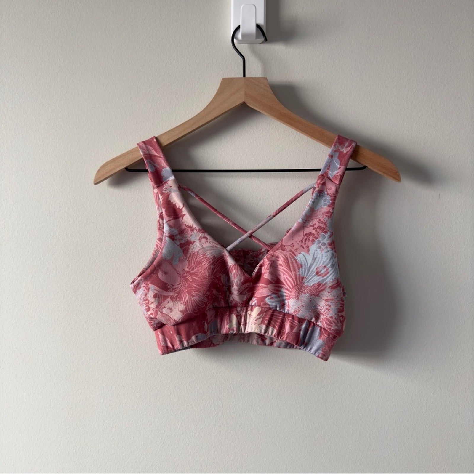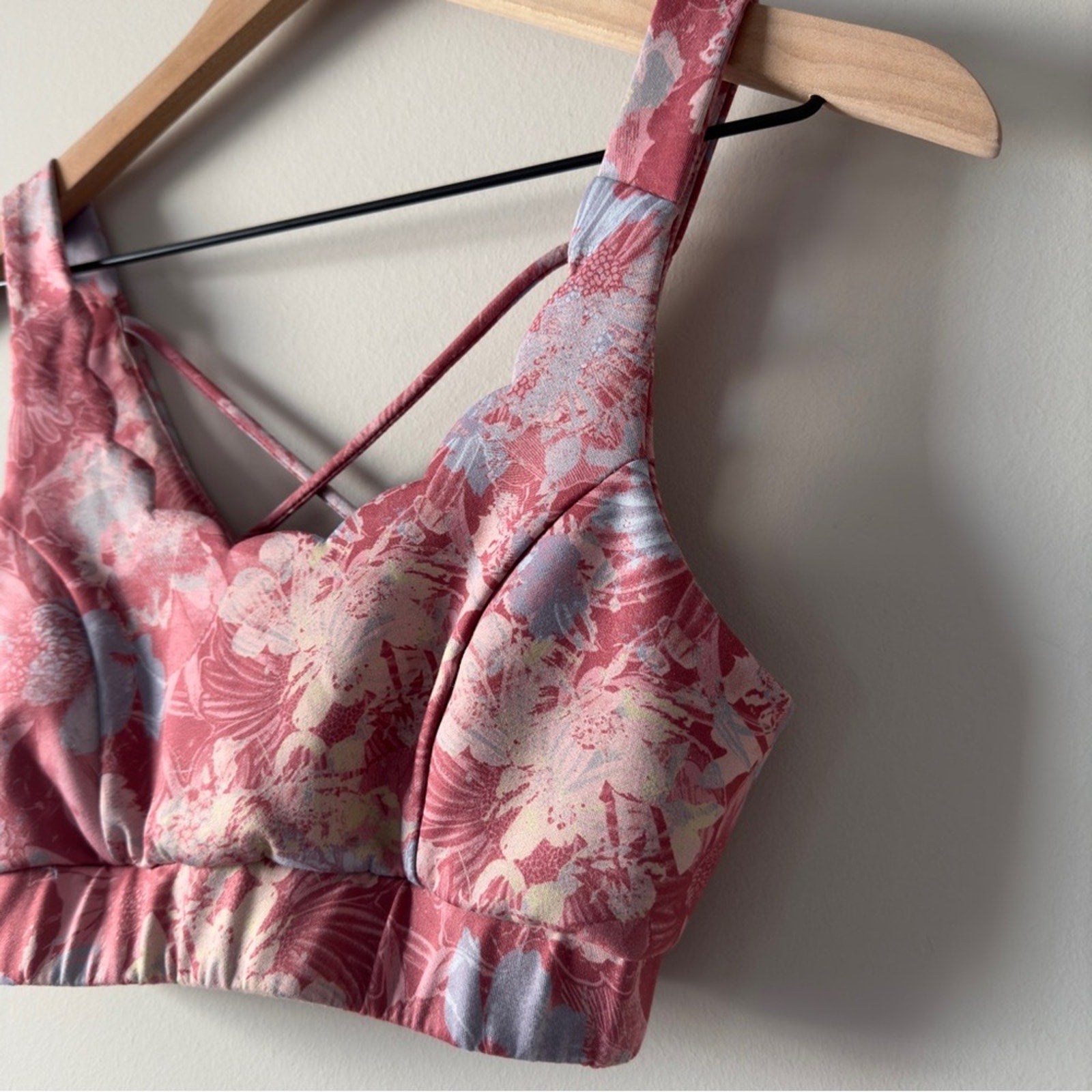 Stylish and comfortable sports bra. Features a beautiful pink floral pattern. Perfect for workouts or casual wear.