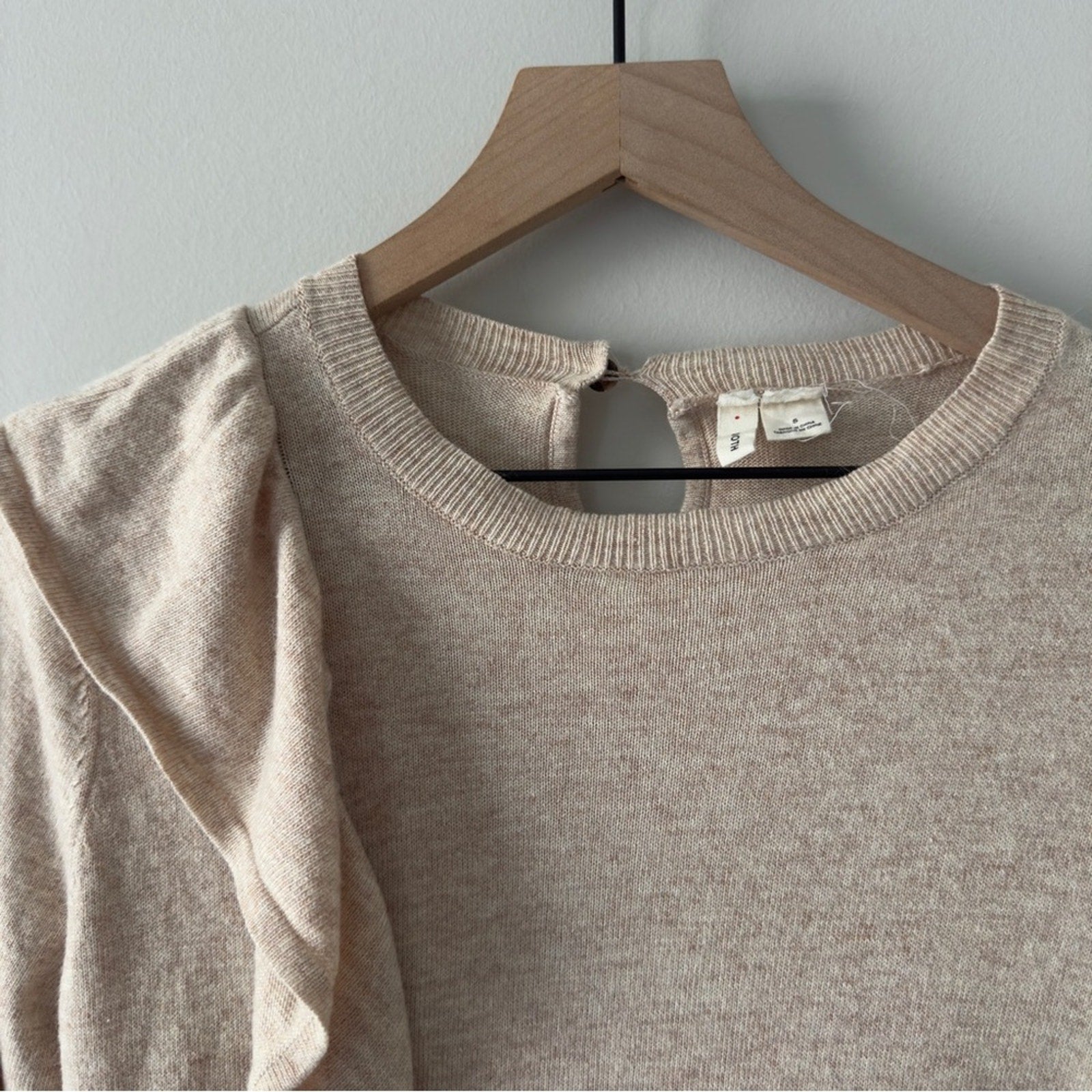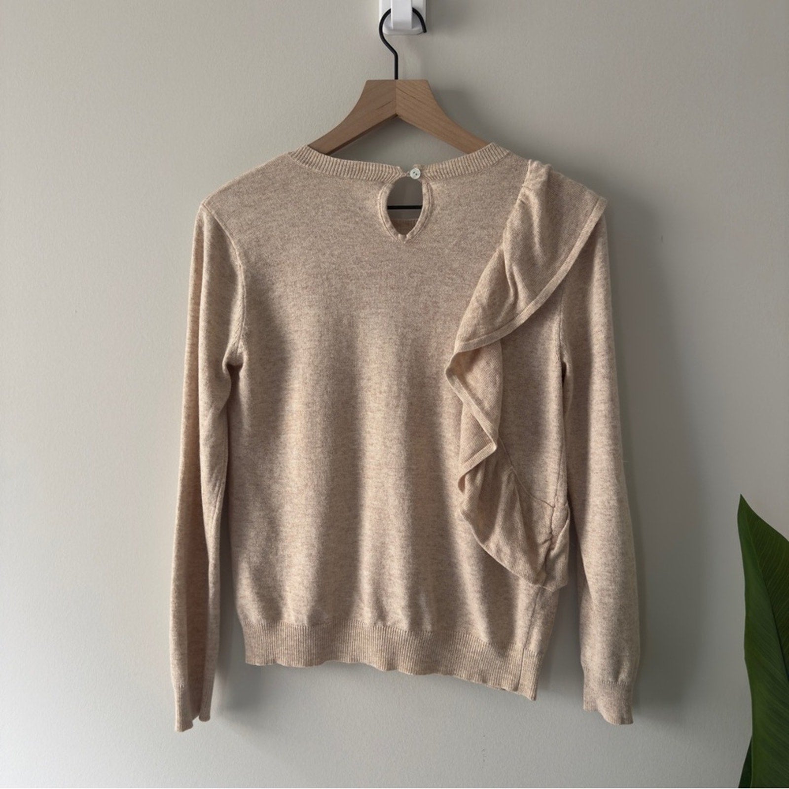 Anthropologie Moth Ruffle Beige tight Knit Sweater long sleeve crew neck keyhole