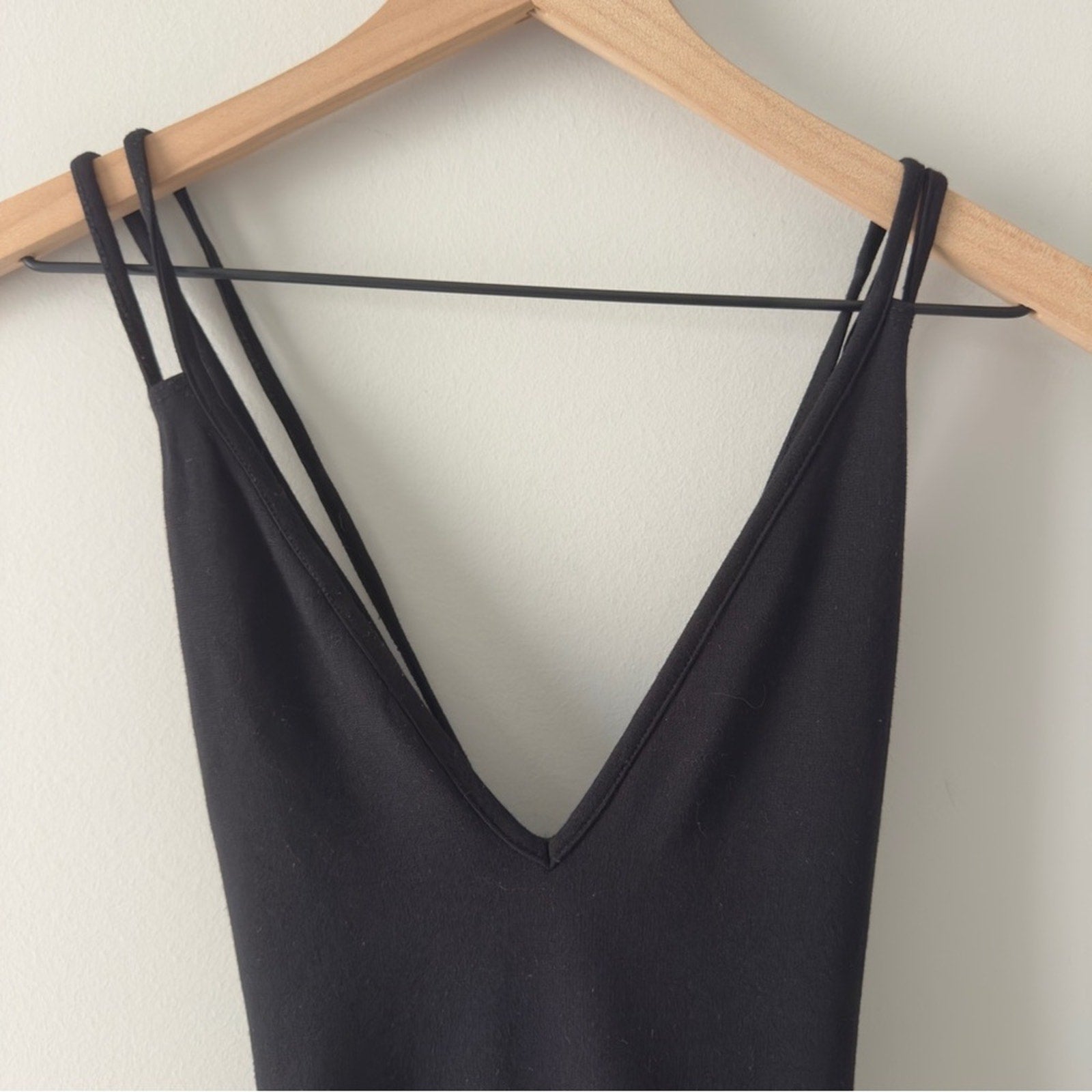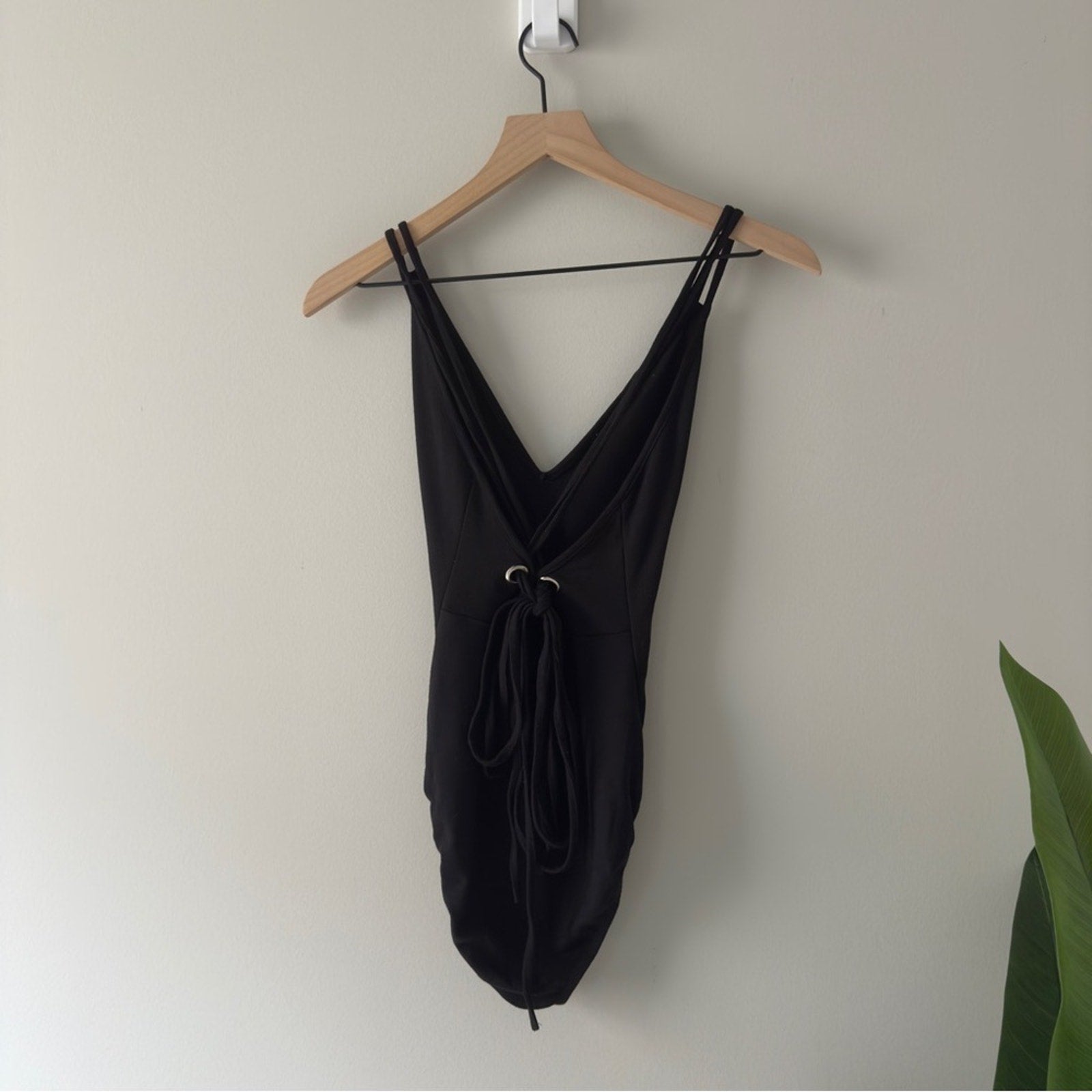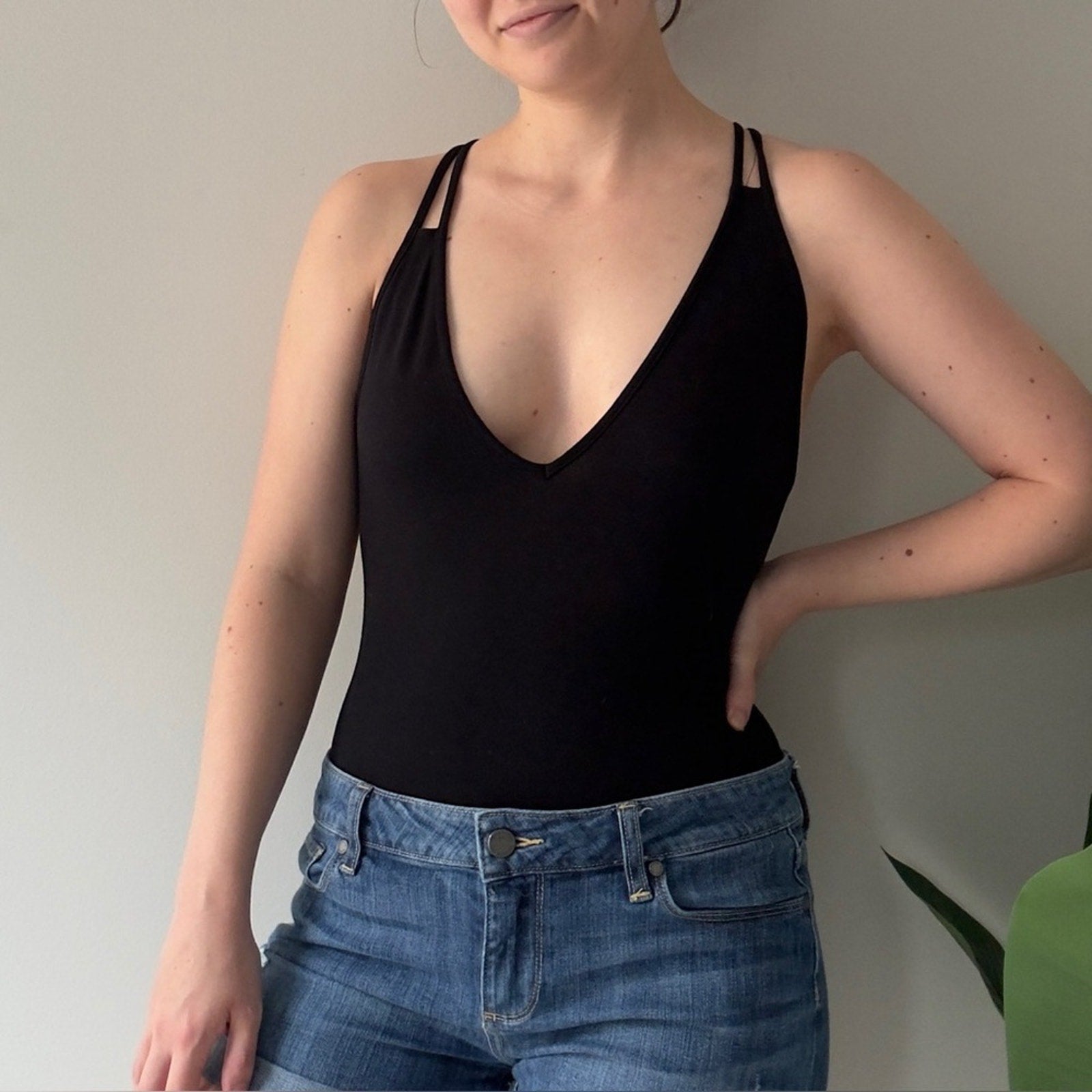 Sleek black bodysuit with strappy design. Perfect for layering or wearing alone.