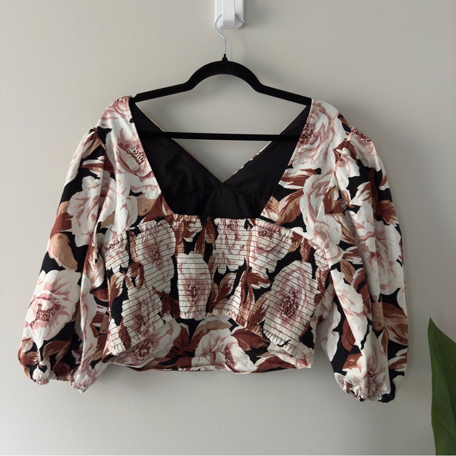 This stylish floral blouse from Express showcases elegant puff sleeves and a chic ruched design, offering a flattering cropped silhouette. The lightweight fabric and gathered details enhance its sophisticated appeal, making it a versatile choice for any fashionable occasion.
