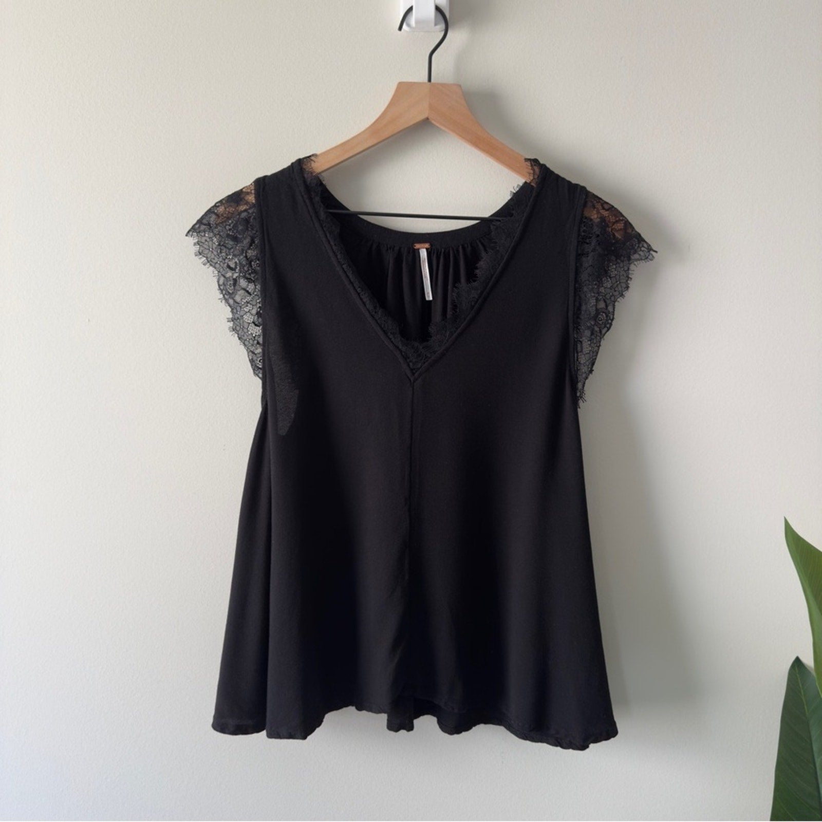 Free People Lovin’ On You Black Lace cap Sleeve Blouse v-neck solid cute minimal