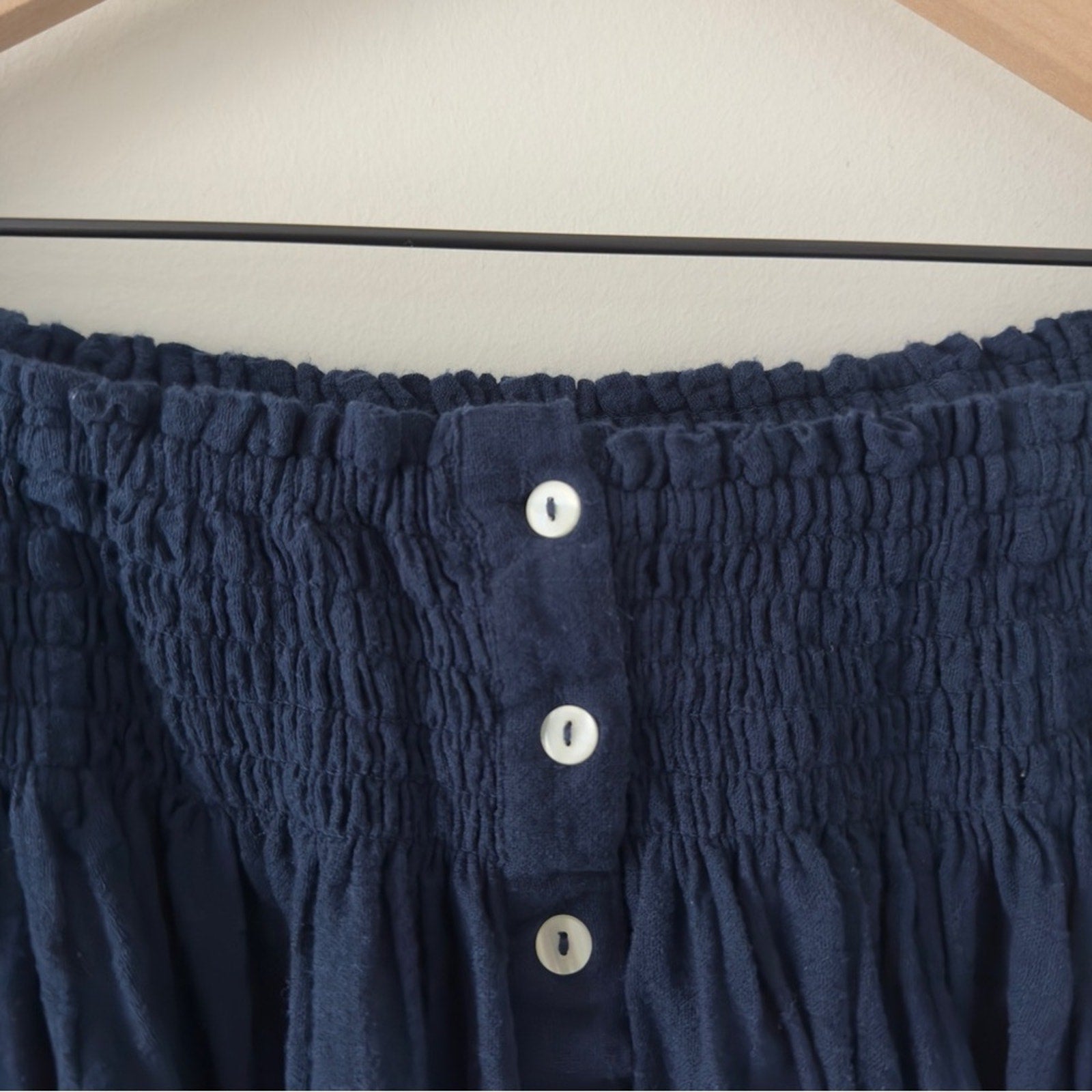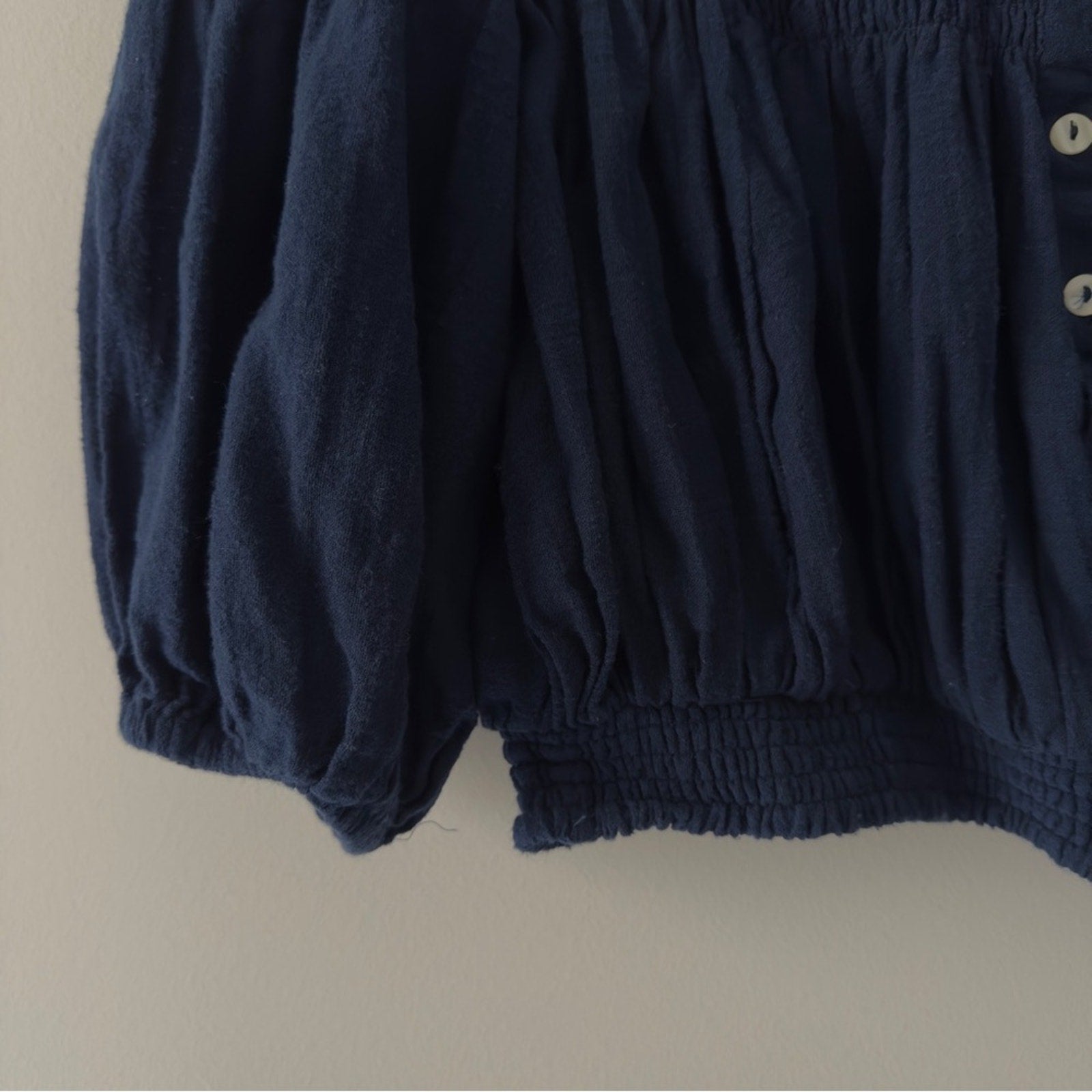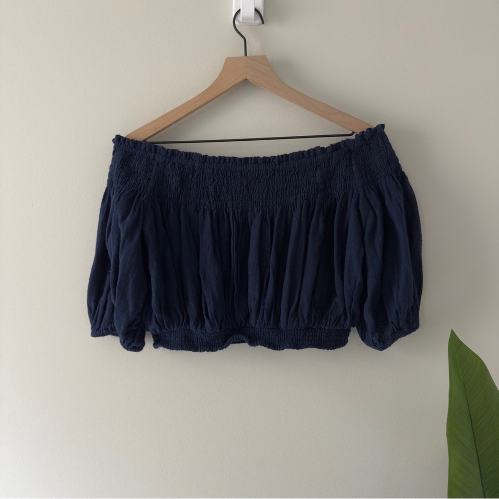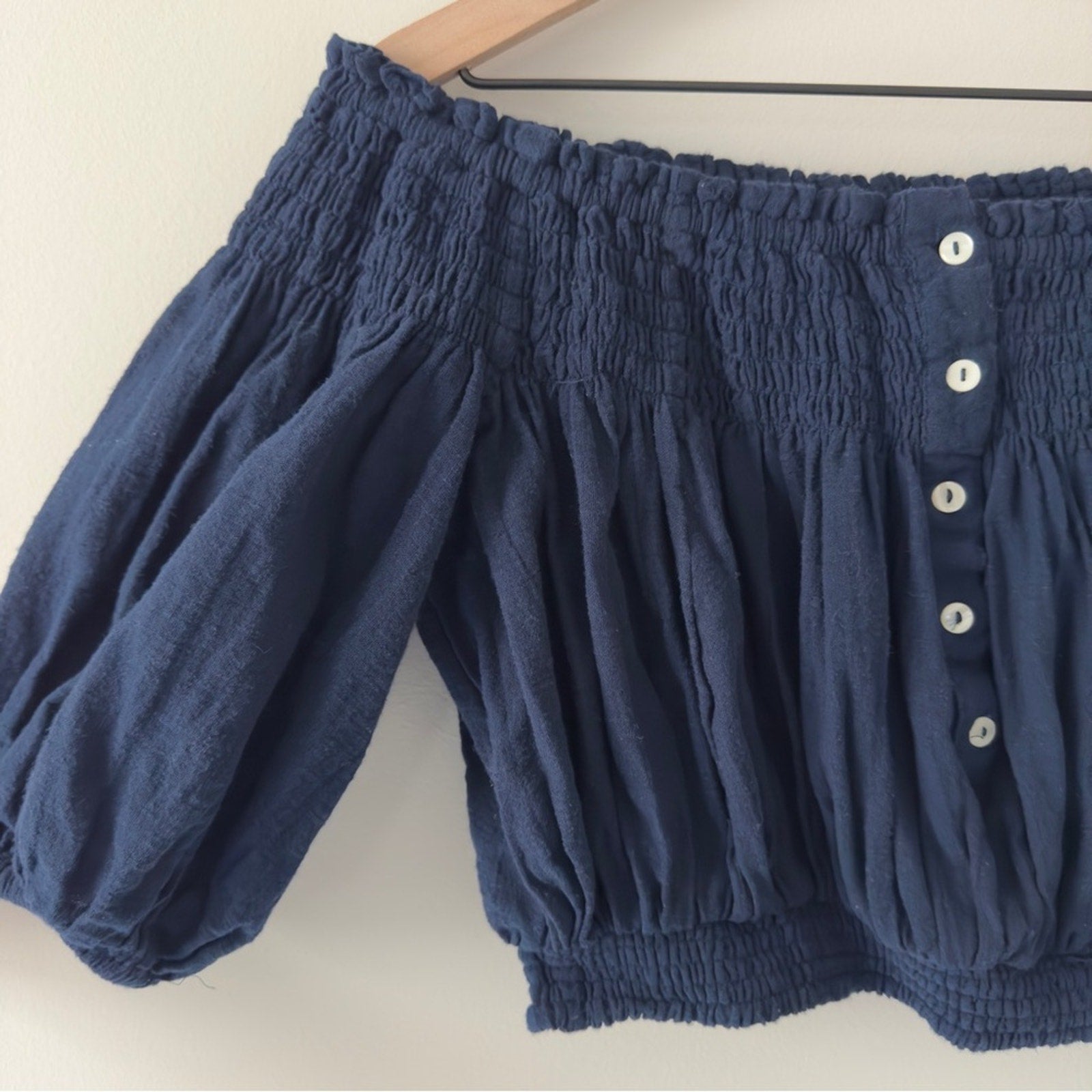 This chic blue blouse from We The Free features a smocked design and off-the-shoulder sleeves, offering a stylish and comfortable fit. The crop style adds a modern touch, making it perfect for casual outings or relaxed gatherings.