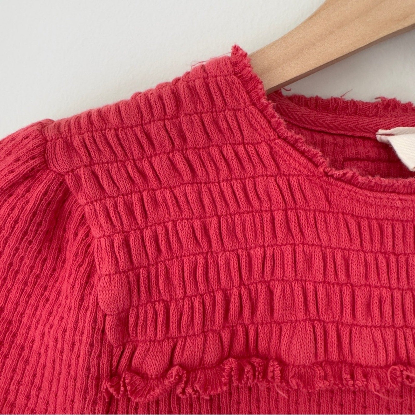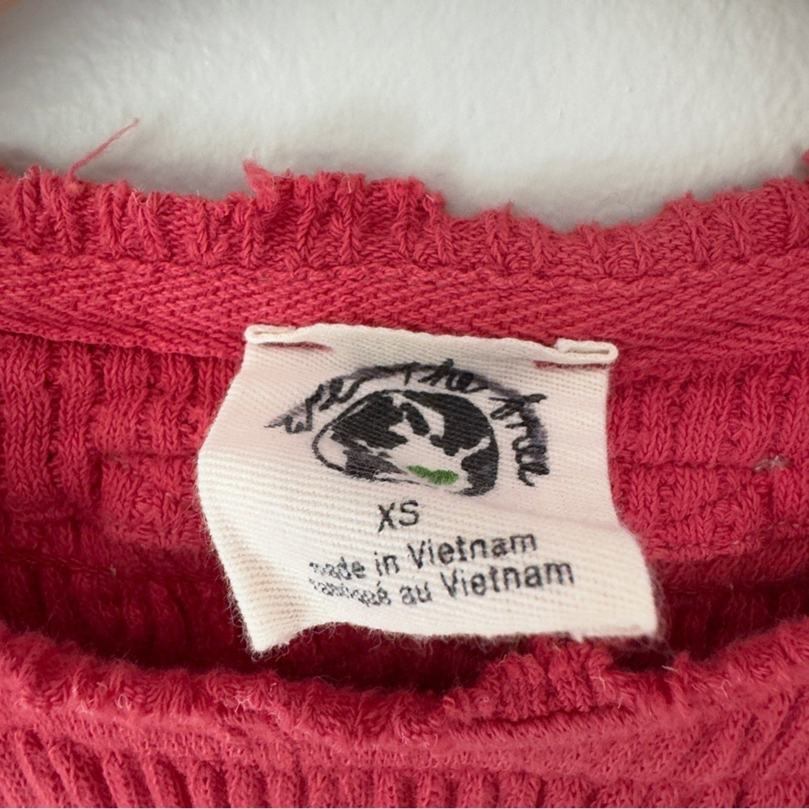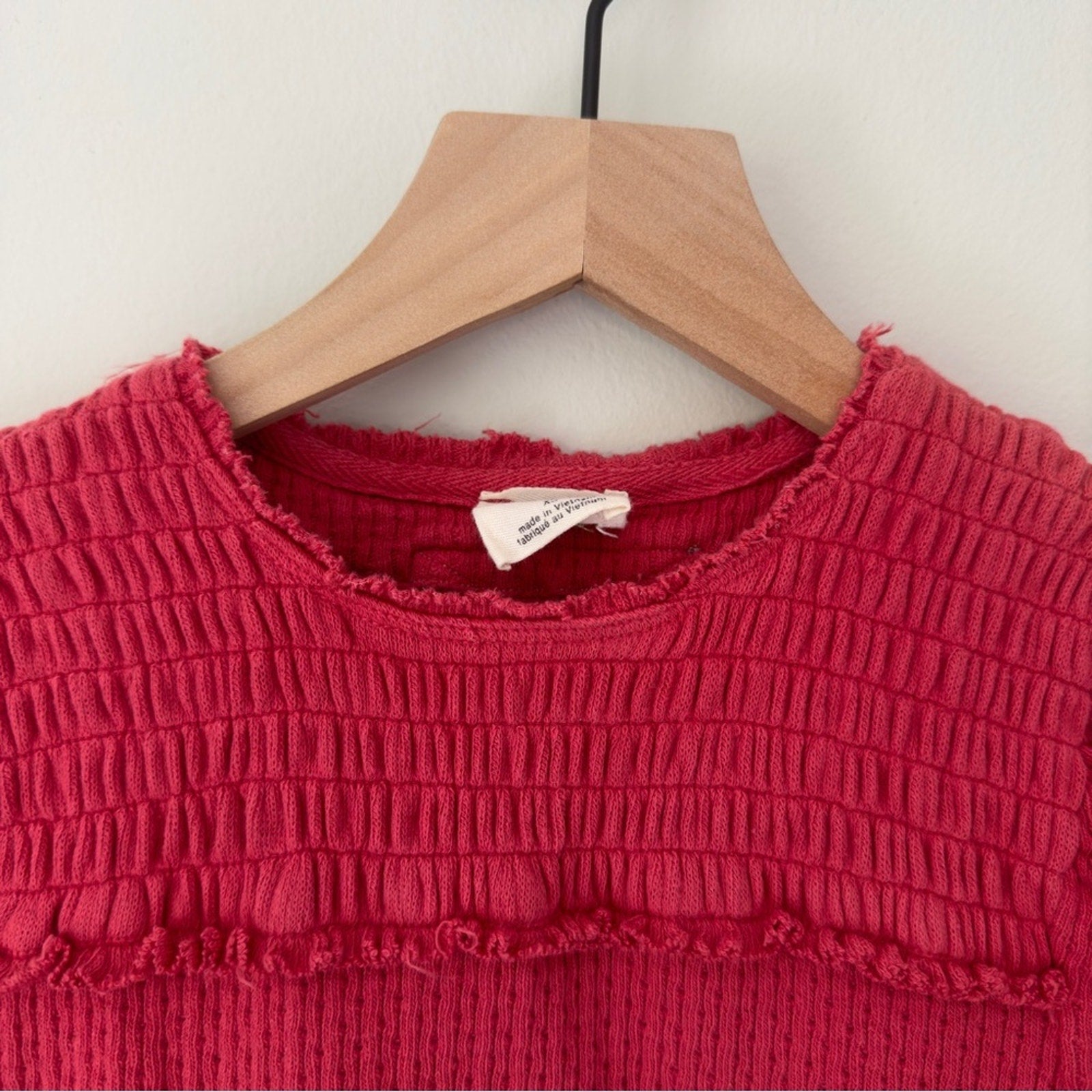 Free People We the Free Smocked Neck Short Sleeve Top Textured Knit Raw Hem EUC