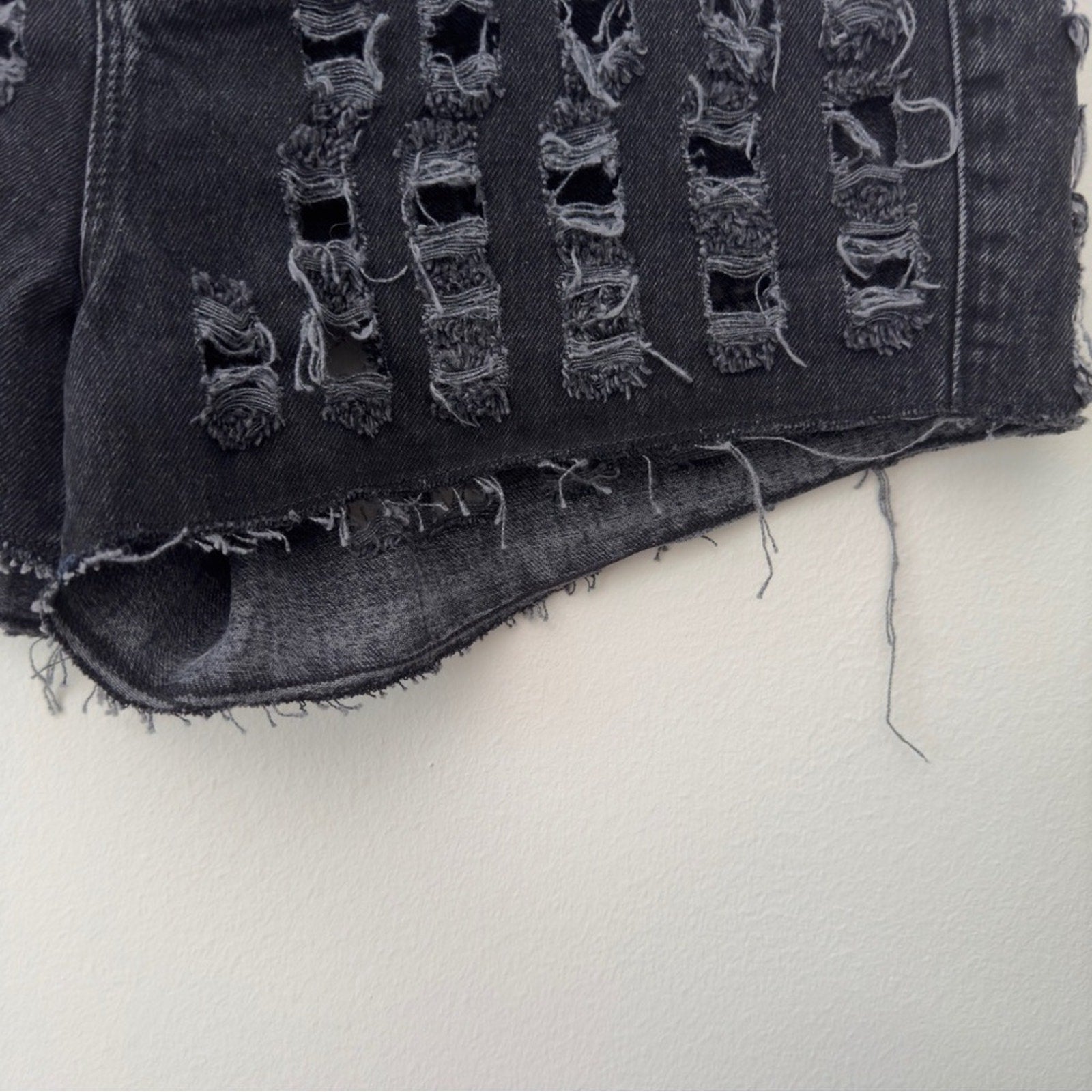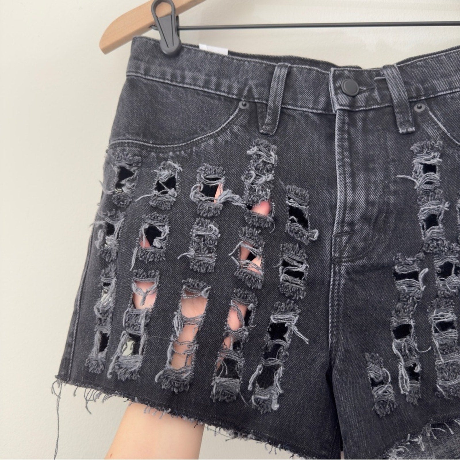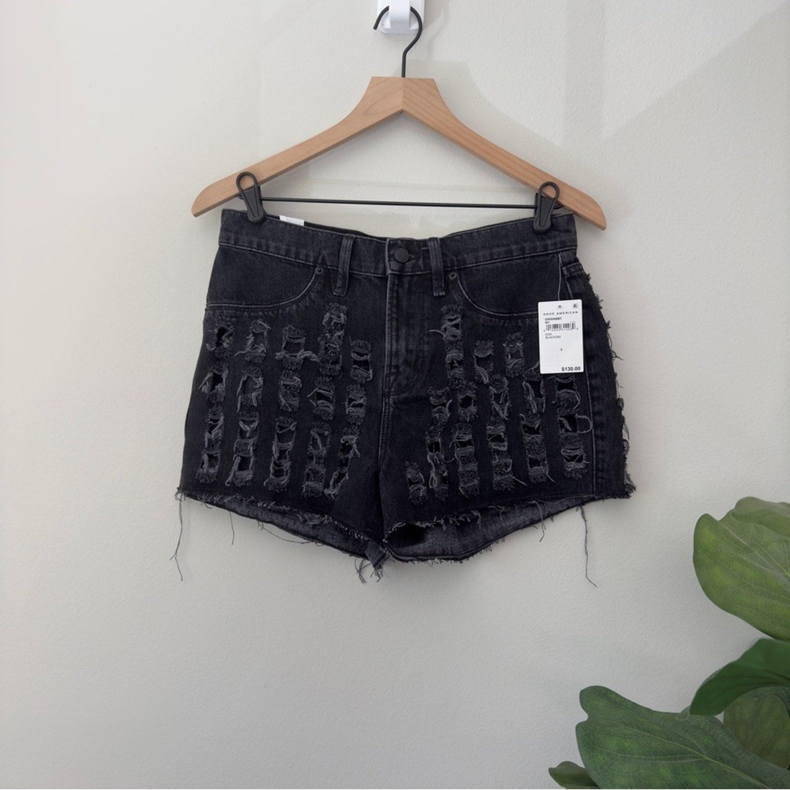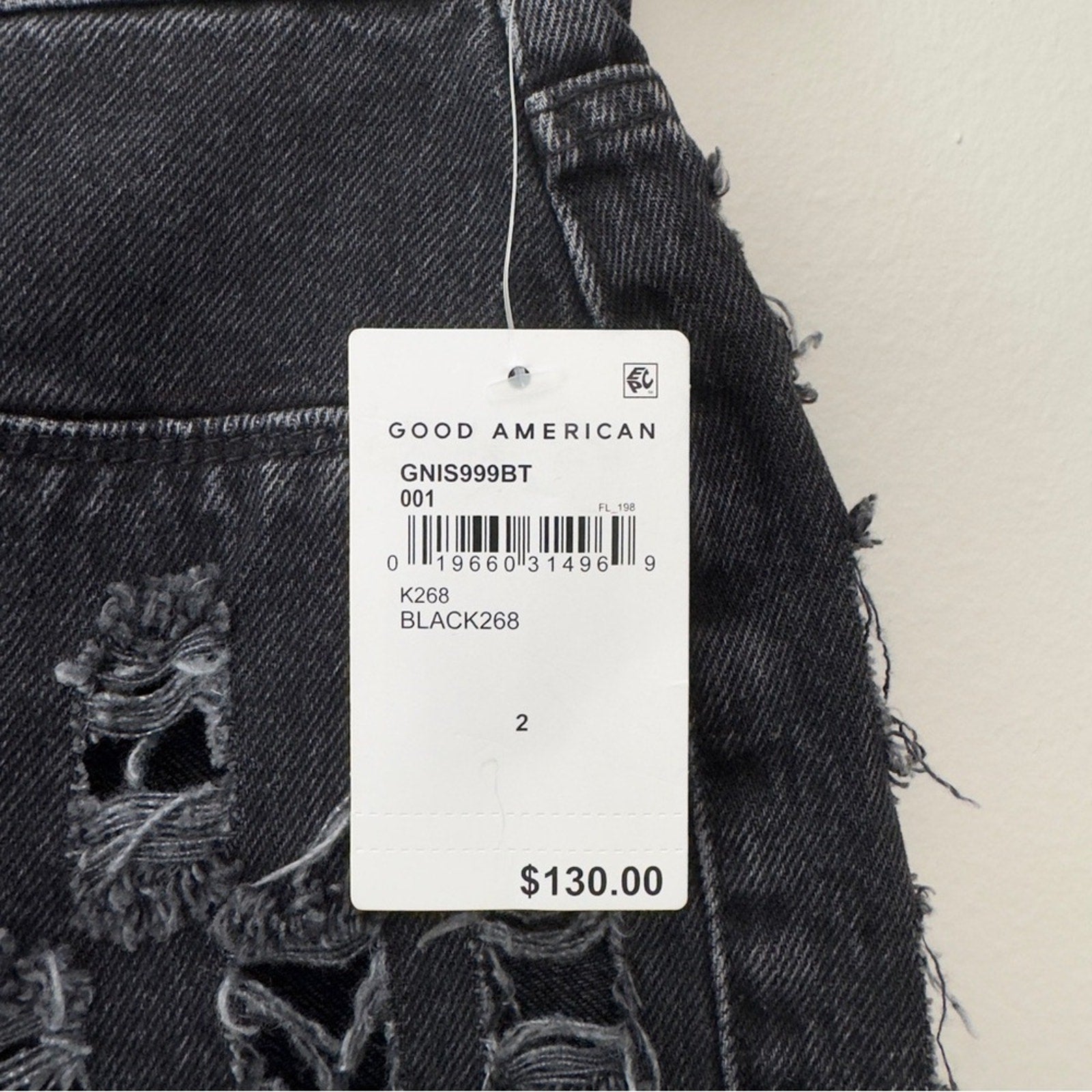 Good American Distressed Cut Off Jean Shorts Cutout Recycled Cotton Pockets Zip