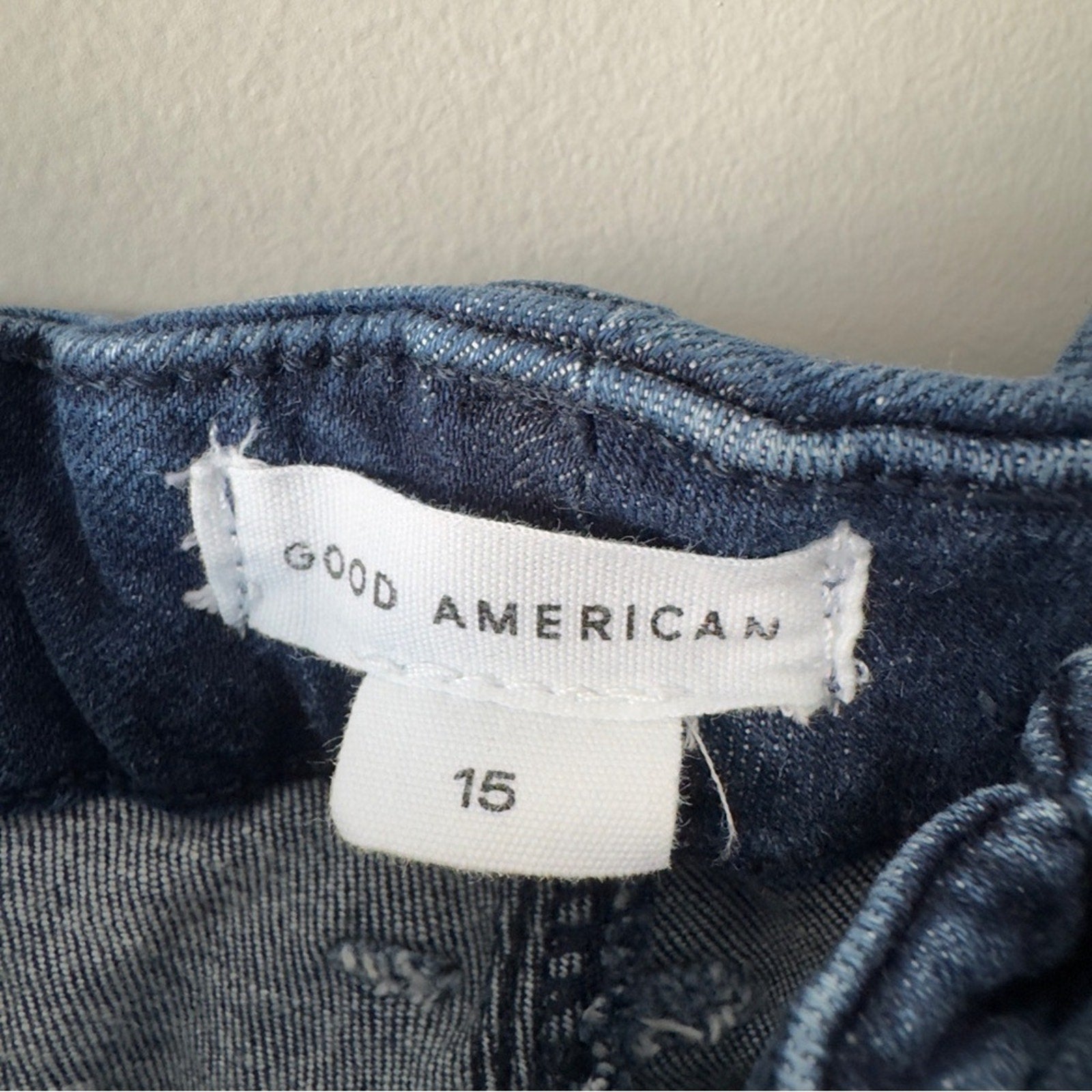 Good American Good Petite Flare Jeans in Blue224 Organic Cotton Dark Wash 15 EUC