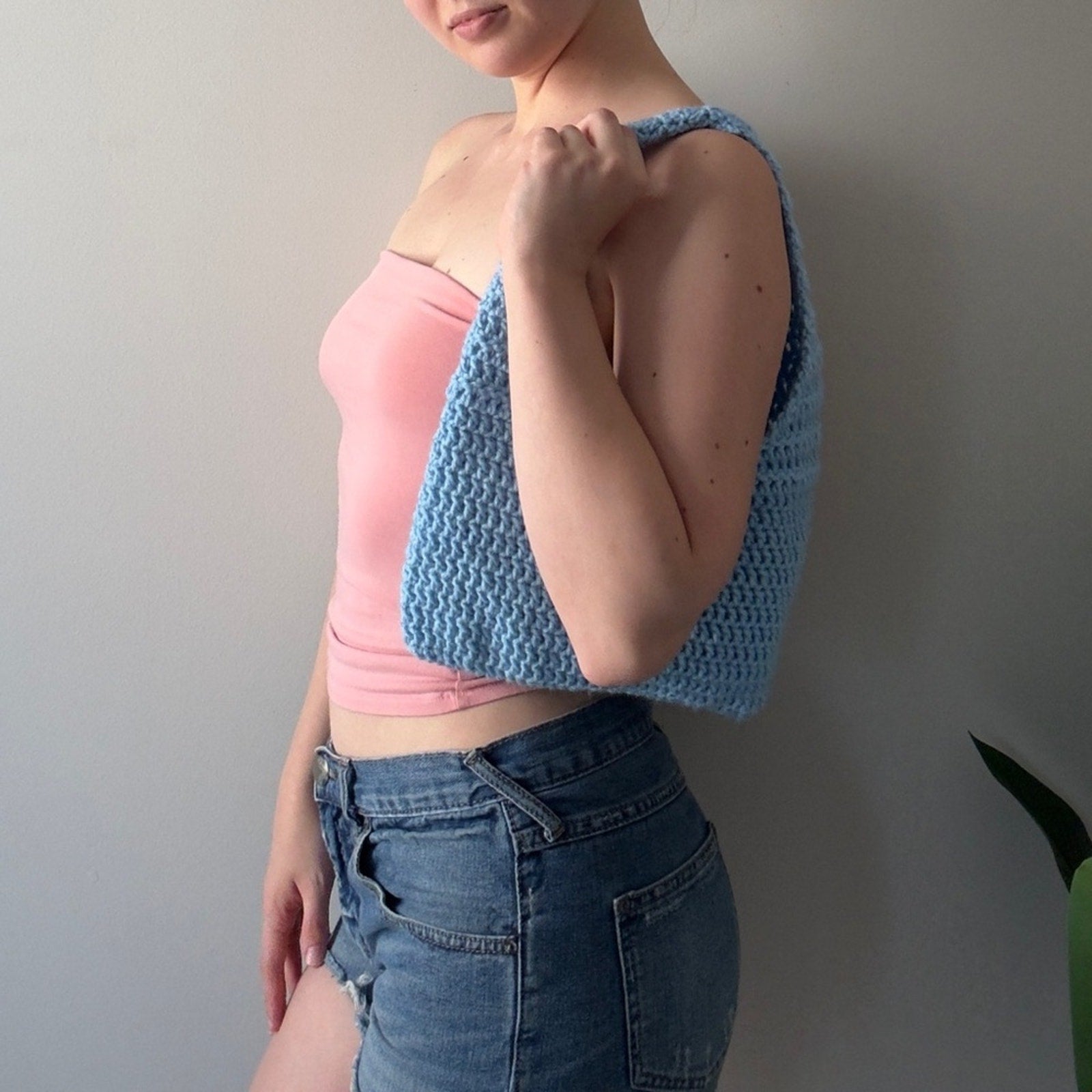 Handmade Crochet Y2K Light Blue Shoulder Bag Solid Knit Cute Lightweight