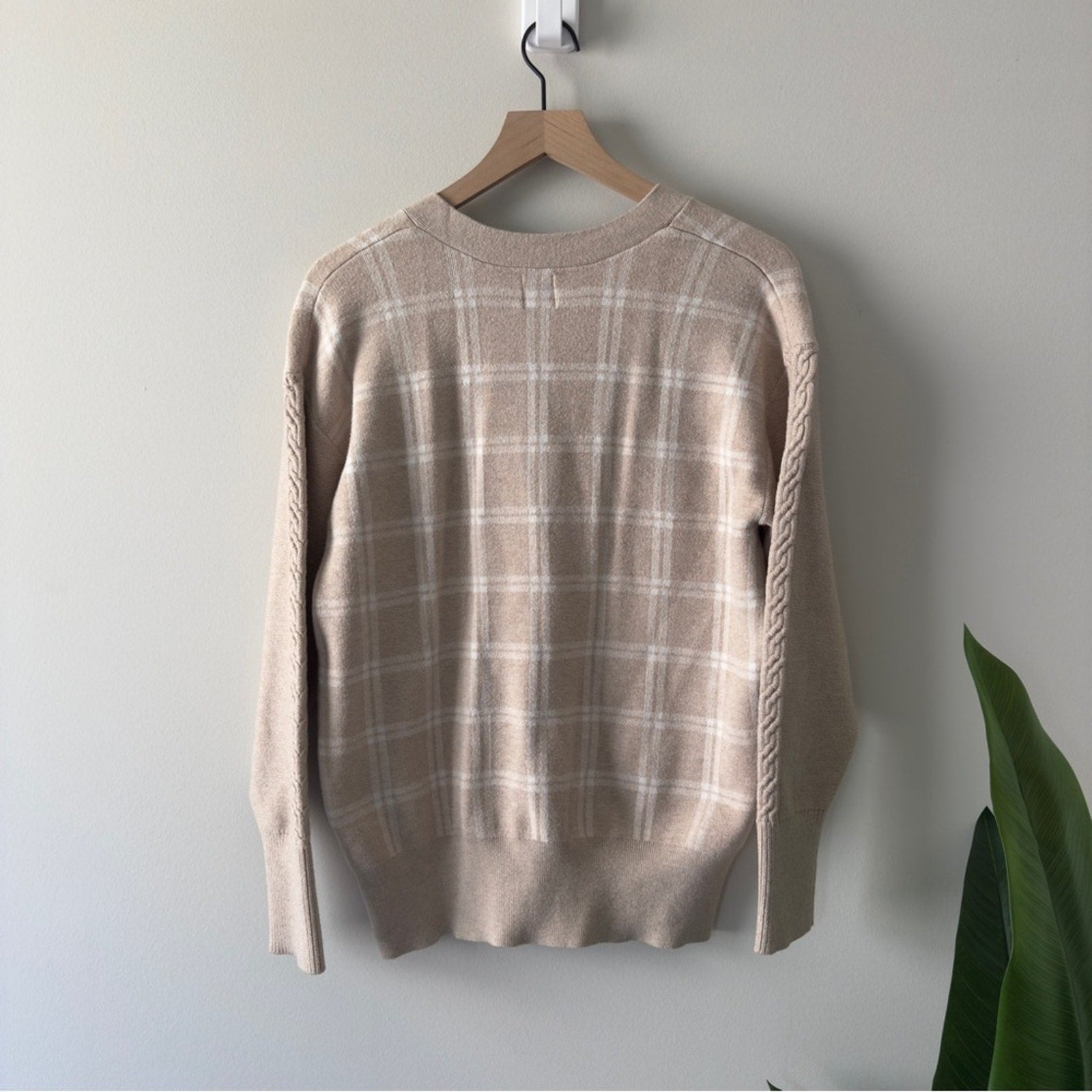 Joie Beige Plaid Cardigan long sleeve cable knit accent button down front