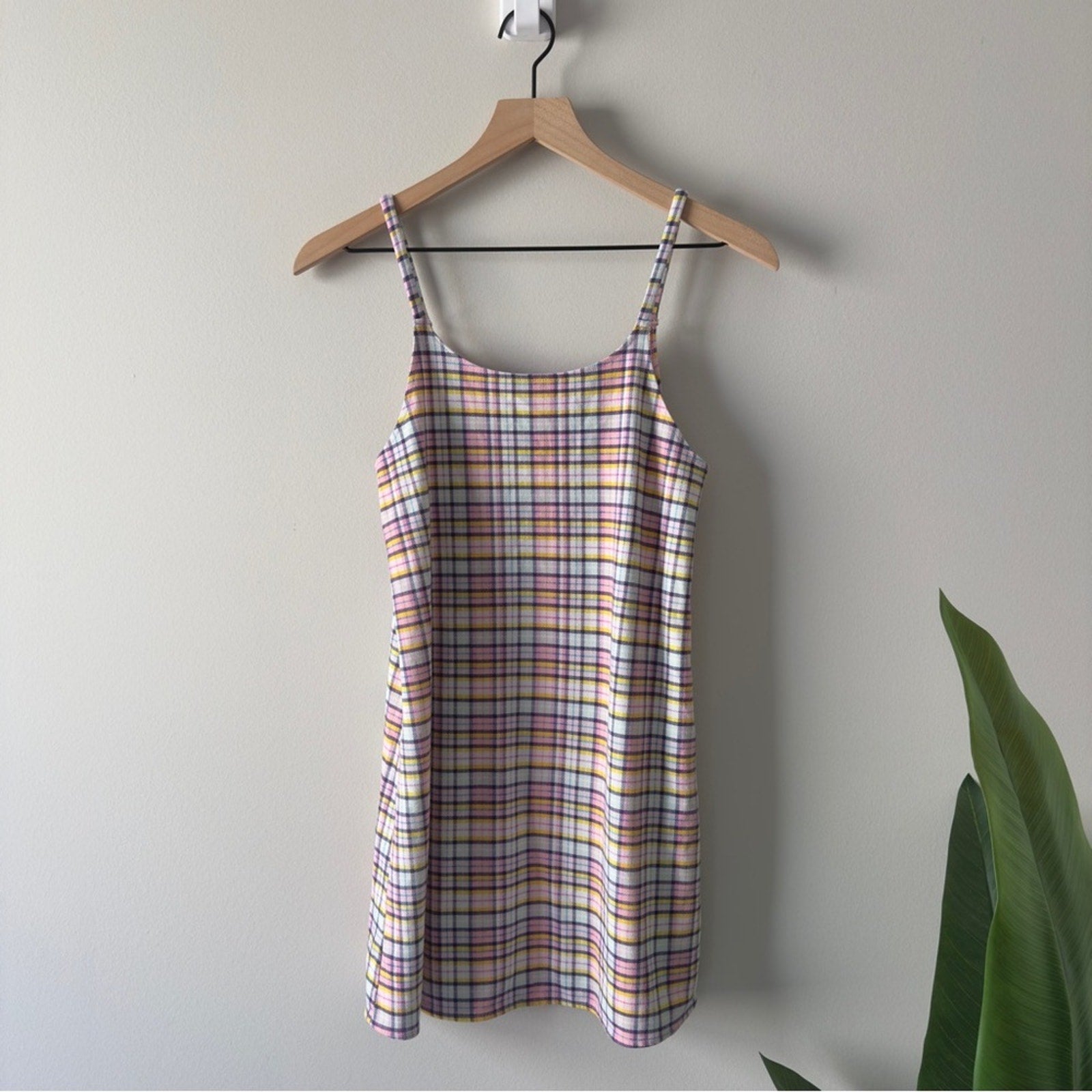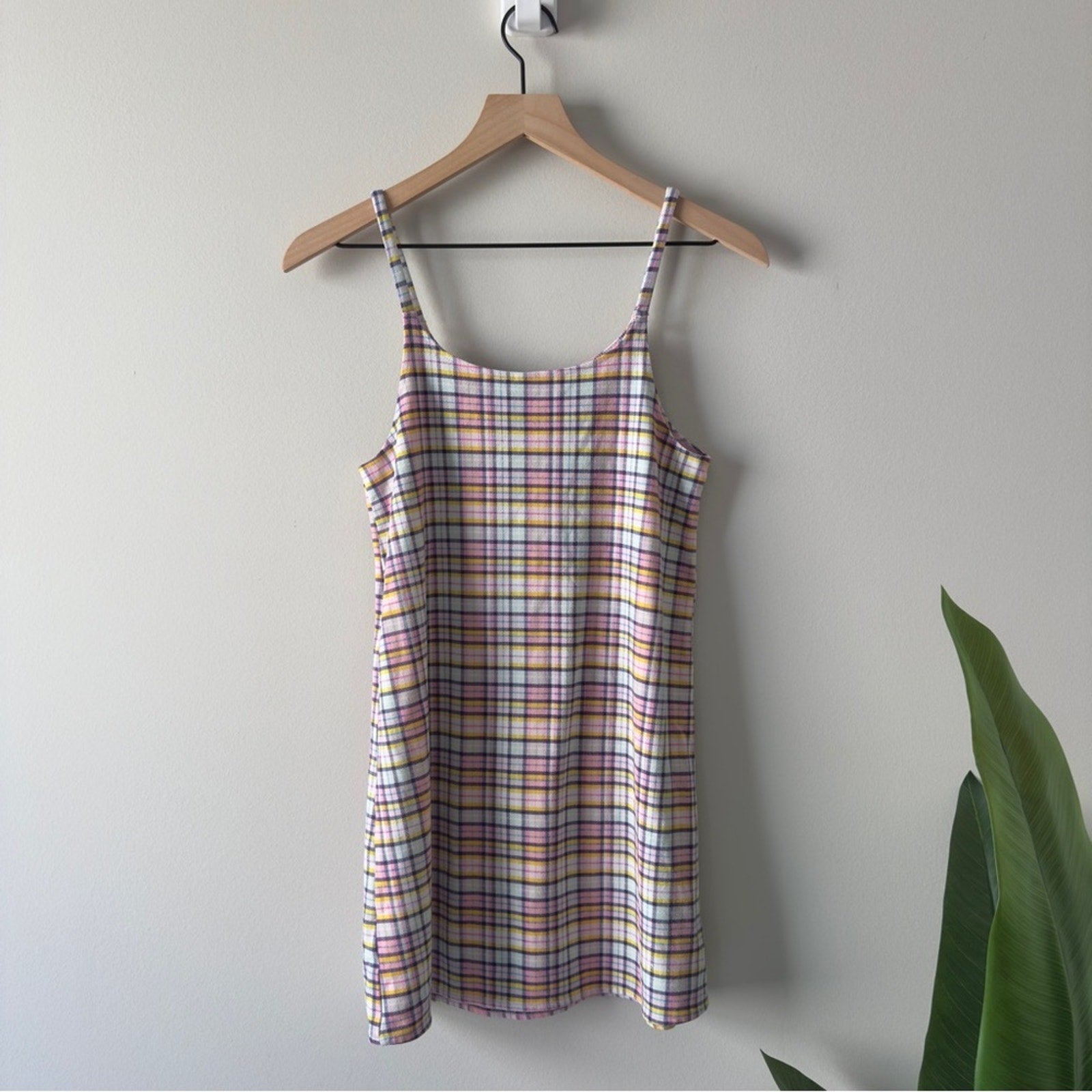 Stylish slip dress with a multicolor plaid pattern. Perfect for casual outings.