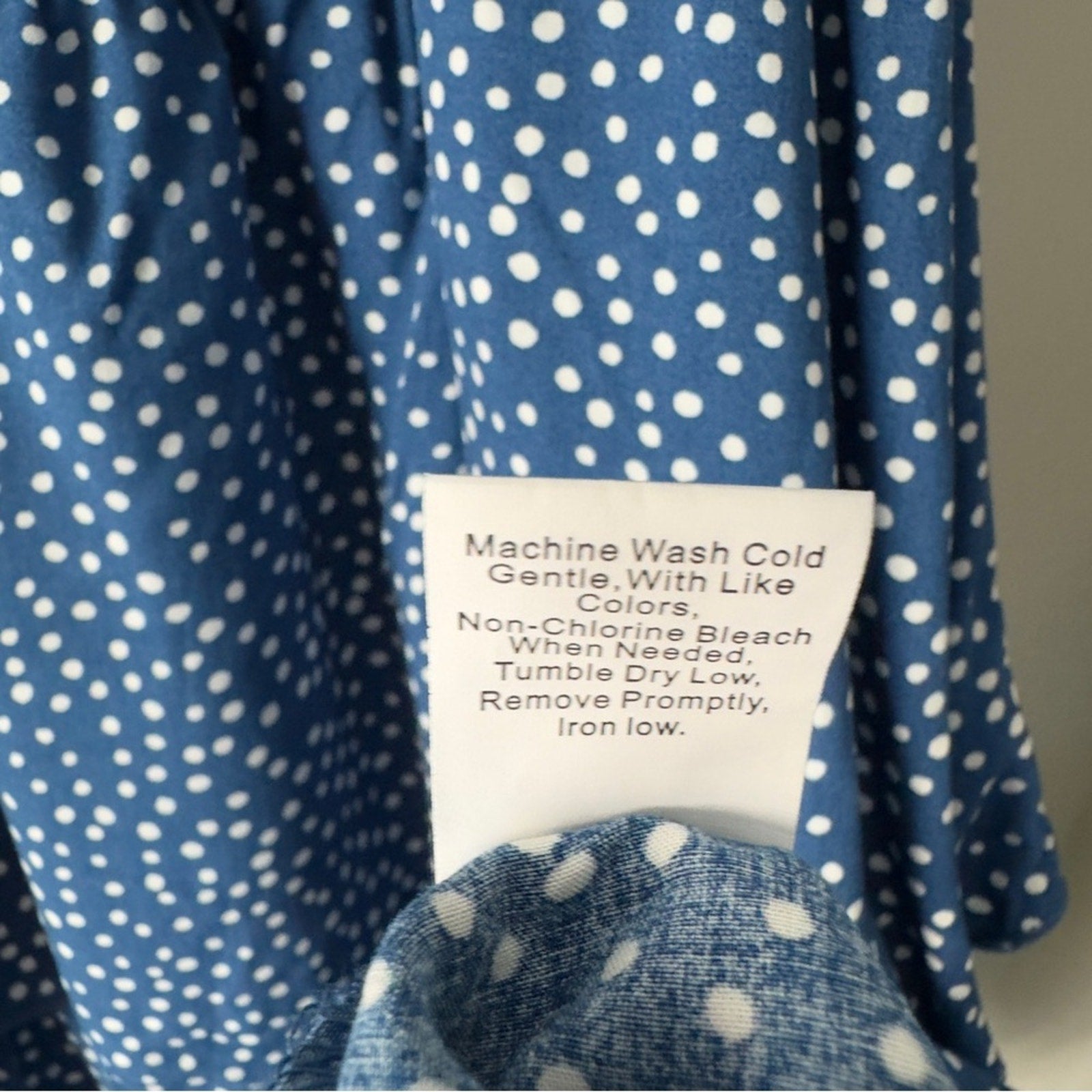 Trendy dress with white polka dots on a blue background. Perfect for casual outings.