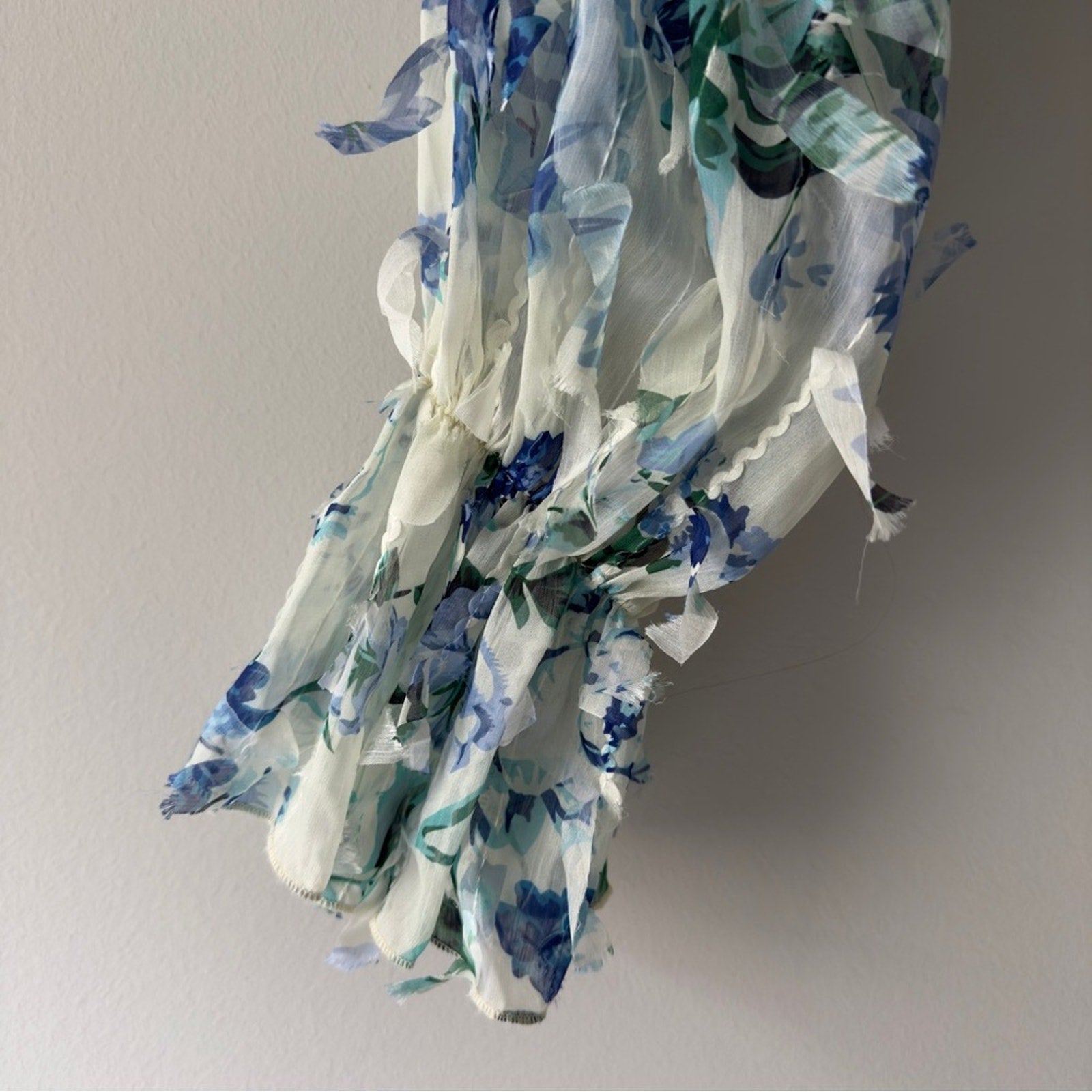 Embrace elegance with this floral off-shoulder ruffle top. Perfect for any occasion, this cream and blue top adds a touch of sophistication to your wardrobe.