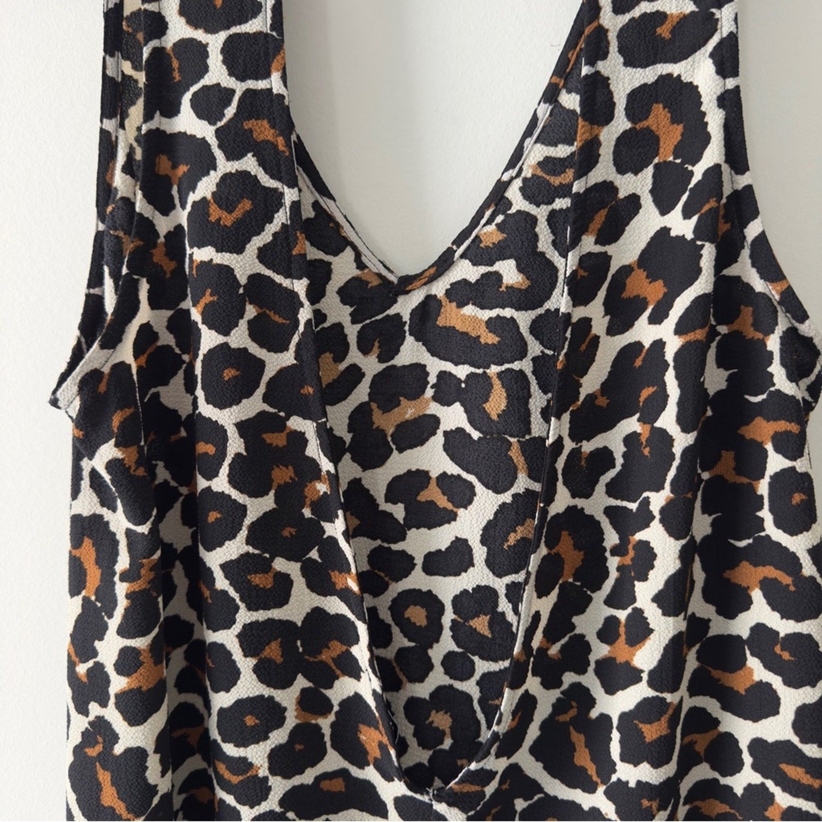 This striking leopard print sheath dress features a sleeveless halter neckline, perfect for a night out. The dress showcases a bold animal print pattern and a backless design, adding a touch of allure to your casual evening ensemble.